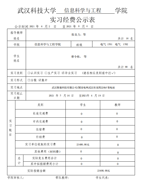 信息學院2017級電氣專業(yè)畢業(yè)實習經(jīng)費公示