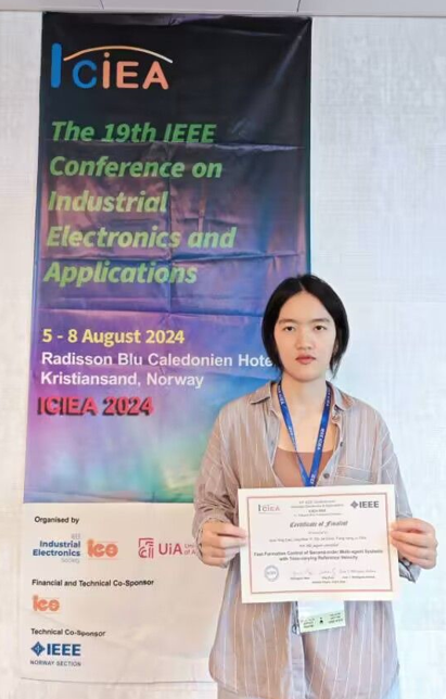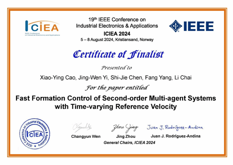 8月5日至8日,第19屆IEEE工業(yè)電子與應(yīng)用國際會議(19th IEEE Conference on Industrial Electronics and Applications, ICIEA 2024)在挪威克里斯蒂安桑召開。集團人工智能與信息融合研究院易靜文副教授課題組碩士研究生曹曉穎的論文“Fast Formation Control of Second-order Multi-agent Systems with Time-varying Reference Velocity”榮獲ICIEA 2024最佳論文入圍獎。